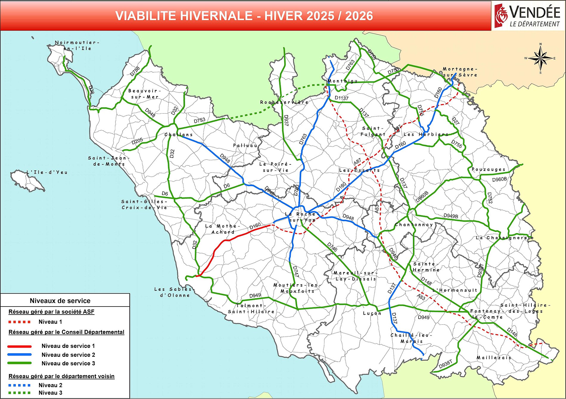En Vendée, le réseau routier départemental est constitué de plus de 4 800 km de routes, dont plus de 150 km de routes 2x2 voies. Le Département de la Vendée assure la gestion et l'entretien de ces routes sur l'ensemble du territoire.